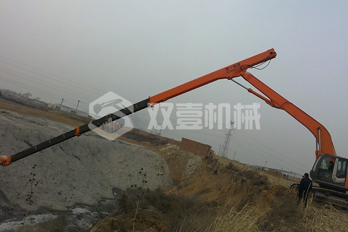 超長(zhǎng)四節(jié)臂:總長(zhǎng)度可達(dá)48米,臂內(nèi)可再伸出3節(jié),施工深度42.5米,配帶貝殼斗1.8立方或挖掘斗1.0立方。